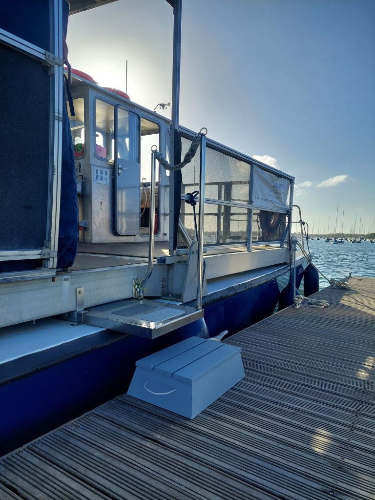 Solar Heritage has a wheelchair lift and is wheelchair-accessible. If you require the use of the lift, please select the appropriate ticket on booking or let the harbour office know in advance of your trip on info@conservancy.co.uk or 01243 512301. Otherwise there are a couple of steps up on to the boat with a rope handrail (see picture below). The crew member will be on hand to provide assistance up the steps if required.